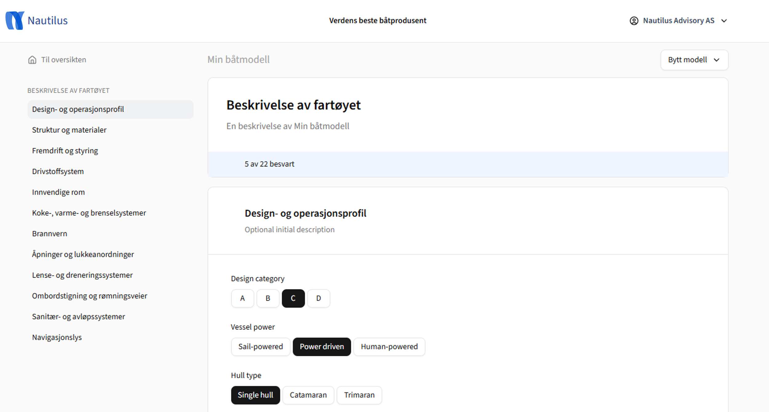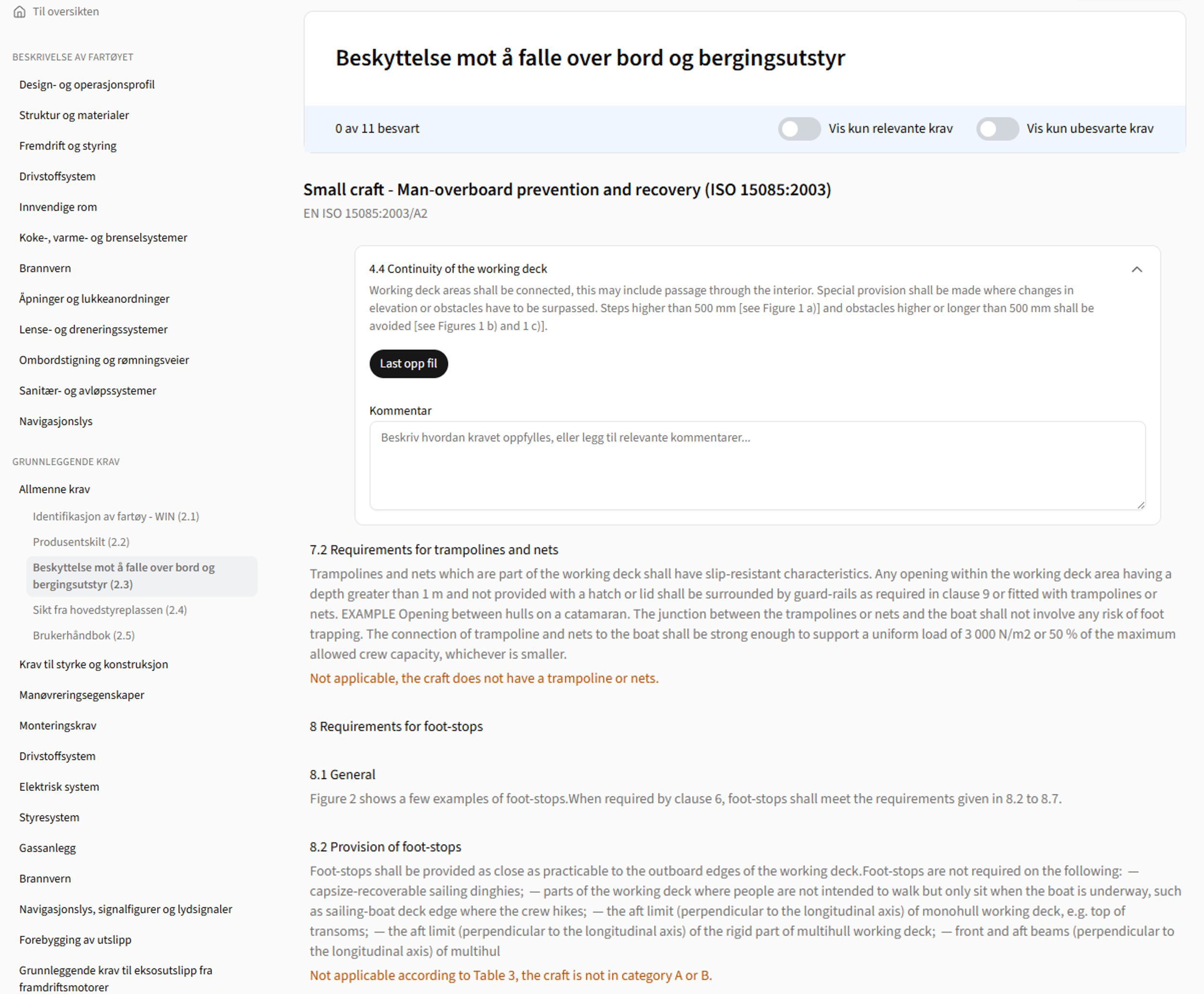 Plattformen identifiserer automatisk hvilke standarder og krav som gjelder for båtmodellen.